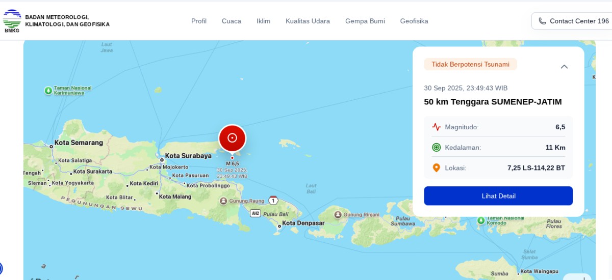 MEDIAKU.CO – Gempa berkekuatan magnitudo 6,5 mengguncang wilayah Kabupaten Sumenep, Jawa Timur, Selasa (30/9) malam sekitar pukul 23.49 WIB.