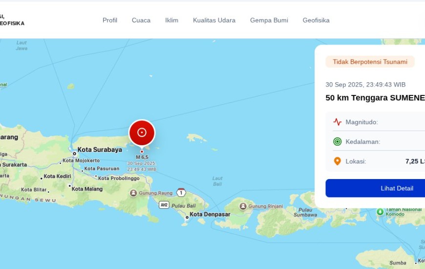 MEDIAKU.CO – Gempa berkekuatan magnitudo 6,5 mengguncang wilayah Kabupaten Sumenep, Jawa Timur, Selasa (30/9) malam sekitar pukul 23.49 WIB. Pusat gempa  ini berada pada koordinat 7.25 lintang selaran,114.22 bujur timur, dengan episenter gempa berada di laut 50 kilometer tenggara Semenep di kedalaman 11 kilometer. “Gempa tidak berpotensi tsunami,” demikian siaran Pers Badan Meteorologi, Klimatologi, dan Geofisika (BMKG) yang dipantau di Pamekasan, Jawa Timur, Rabu pagi Gempa yang terjadi … Lanjutkan membaca Gempa Magnitudo 6,5 Guncang Sumenep Madura